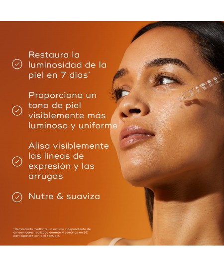 Se ha demostrado que alisa simultáneamente el aspecto de las líneas finas y las arrugas al tiempo que potencia visiblemente el brillo y la luminosidad de la piel.