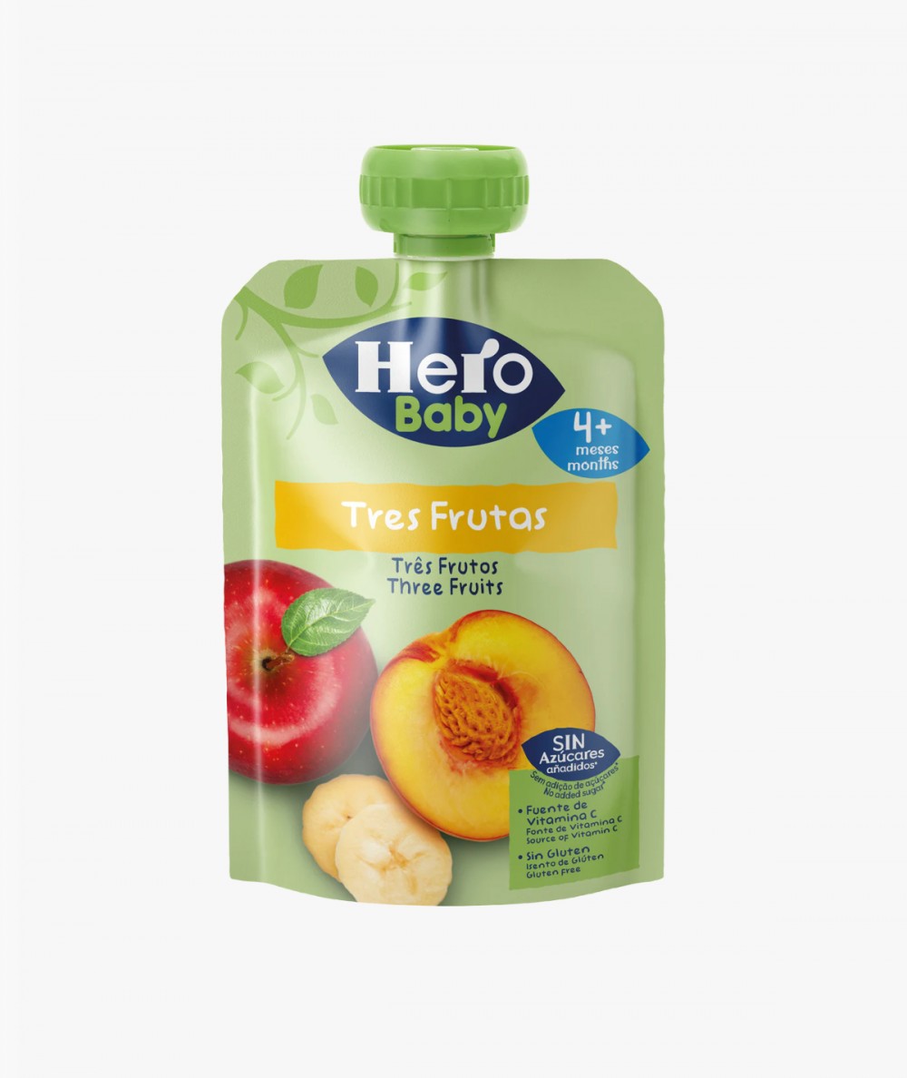 Bolsita Hero Baby tres frutas. Apta para bebés desde 4 meses. Elaborada bajo los estándares de la Calidad Baby y conservando lo bueno de la naturaleza. Sin azúcares añadidos, sin gluten. No necesitan frío. Sabor tres frutas: melocotón, manzana y plátano.